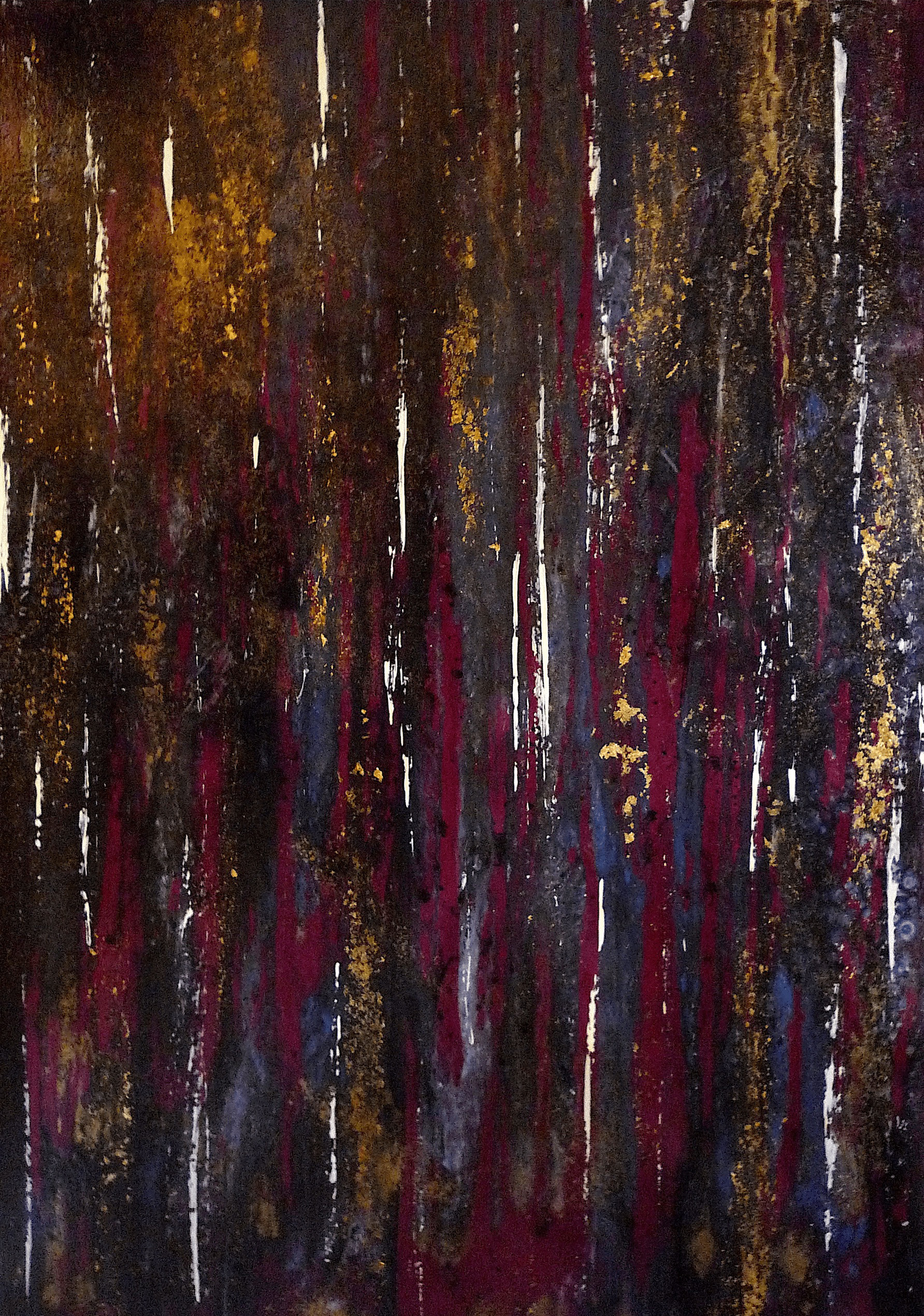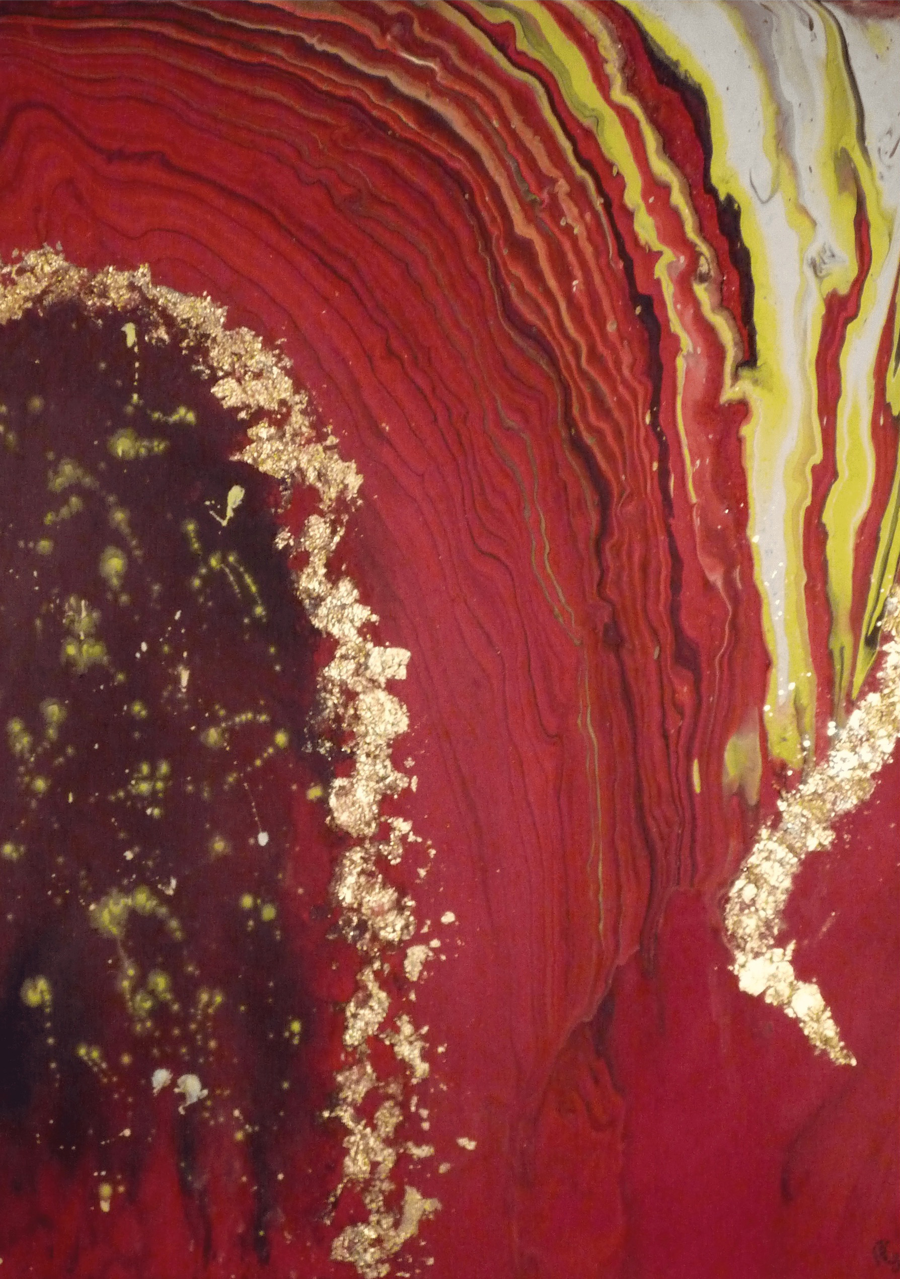 Beschreibung: Acryl und Gold auf Leinwand, rot gerahmt.